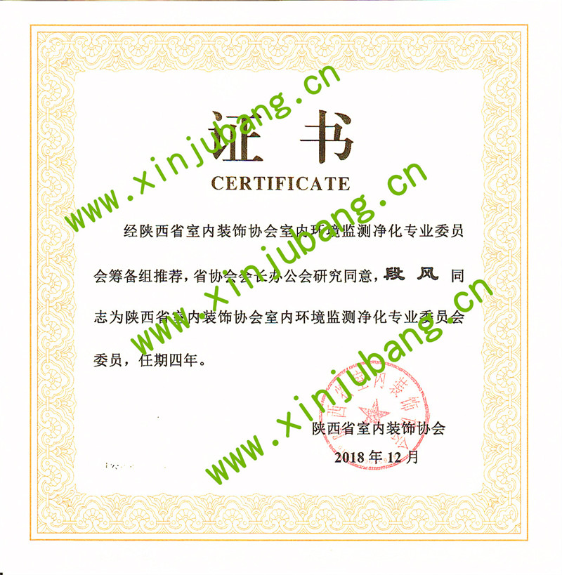 首先具備的是室內空氣凈化公司資質,完善的工商和稅務等證照齊全。陜西新居邦環保科技公司是首家擁有國家級機構頒發許可認證的高級治理員、室內環境達標評審員,陜西室內裝飾協會室內環境監測凈化專業委員會委員的專業除甲醛公司。